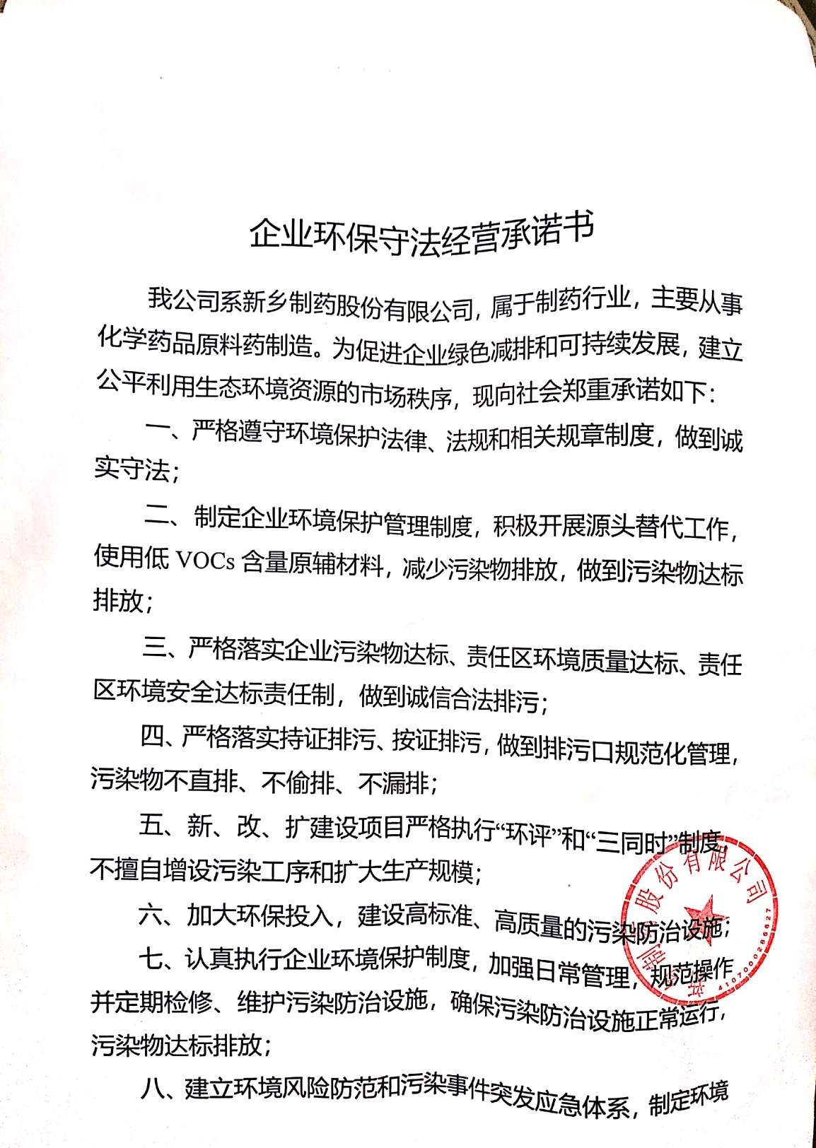 企業(yè)環(huán)保守法經(jīng)營(yíng)承諾書(shū)